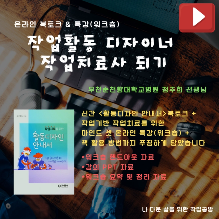 안녕하세요. 순천향부속 부천병원 작업치료사로 23년째 근무중인 작업치료사 정주희입니다. 급성기, 아급성기 질환으로 생활이 불편해지신 클라이언트와 조금씩 그들의 삶으로 들어가는 여정을 함께 하고 있습니다. 개인의 고유함을 인정하고, 개인의 존재감을 다시 찾아가도록 작은 활동부터 시작하는 일을 의료환경에서 제공하고 있습니다. 클라이언트도 자기를 찾아가고 더불어 저또한 작업치료사로서 저를 찾아갔던 임상경험을 이번 짧은 강의를 통해 함께 나누고자 합니다. 나만이 유일하게 할 수 있는 일! 그게 바로 우리(Otist)를 존재하게 하는 이유인것 같습니다.