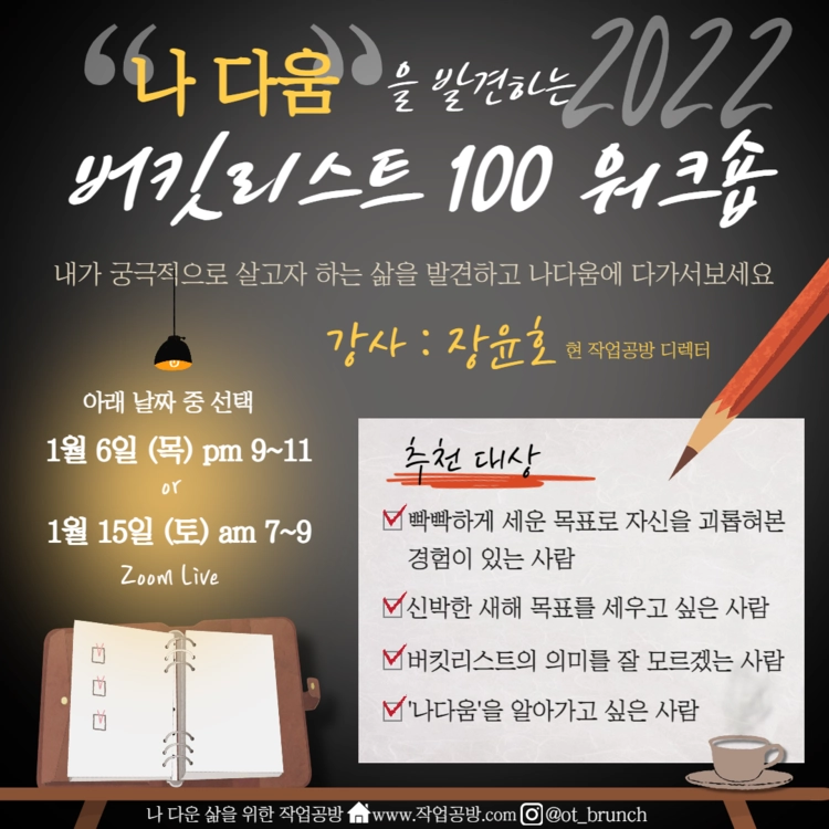 더이상 미루지 말고 버킷리스트를 함께 적으며 내가 궁극적으로 살고자 하는 삶을 발견하고 나 다운 삶을 위한 행동을 시작해보세요!