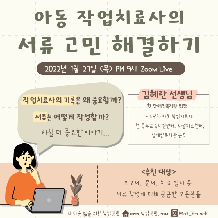1/27(목) 🌱아동 작업치료사의 서류 고민 해결하기🌱 강의를 맡은 그린쓰(김혜란) 입니다. ^^
