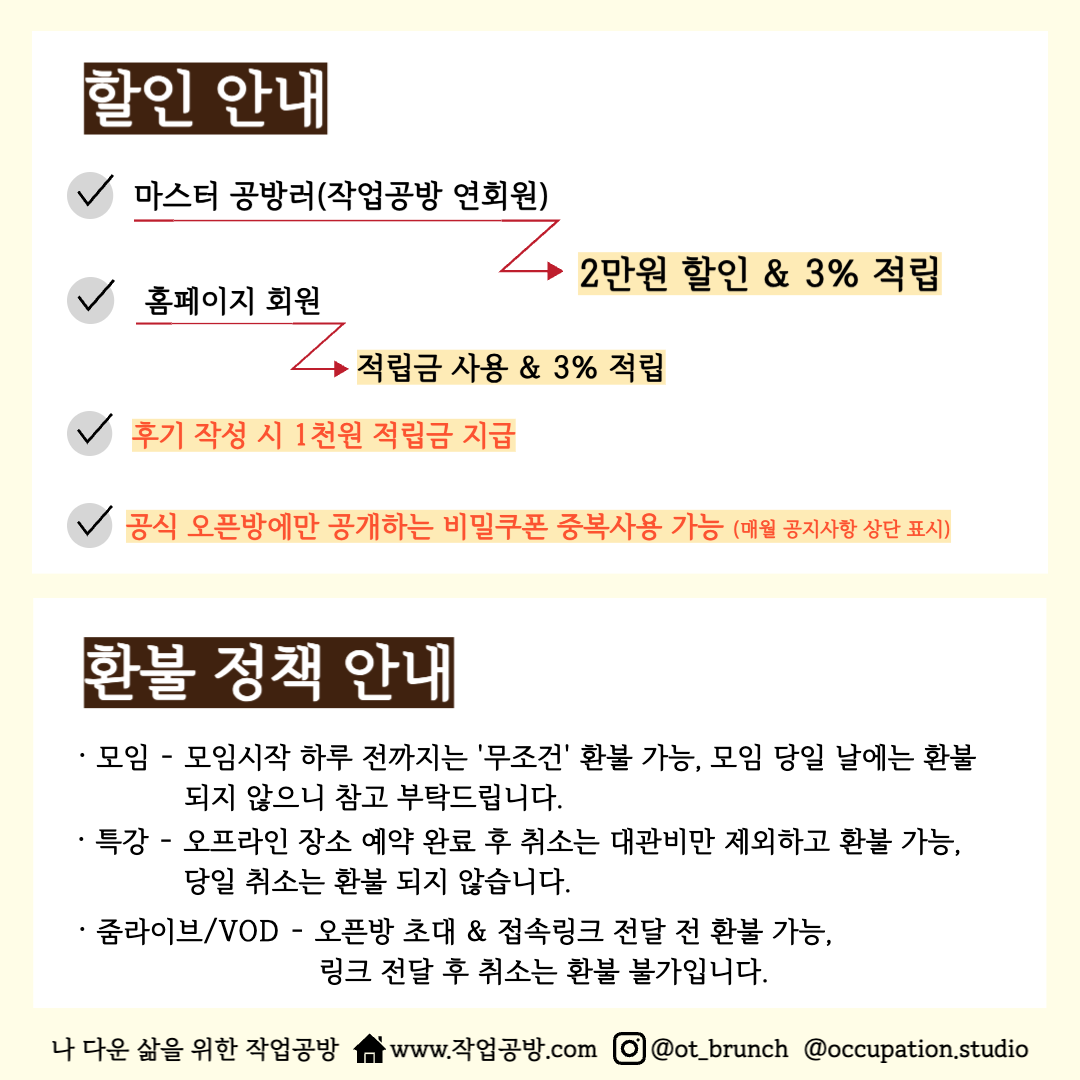 특강 | 오프라인 장소 예약 완료 후 취소는 대관비 및 핸드아웃 비용 제외하고 환불되며, 당일 취소는 환불 불가 |